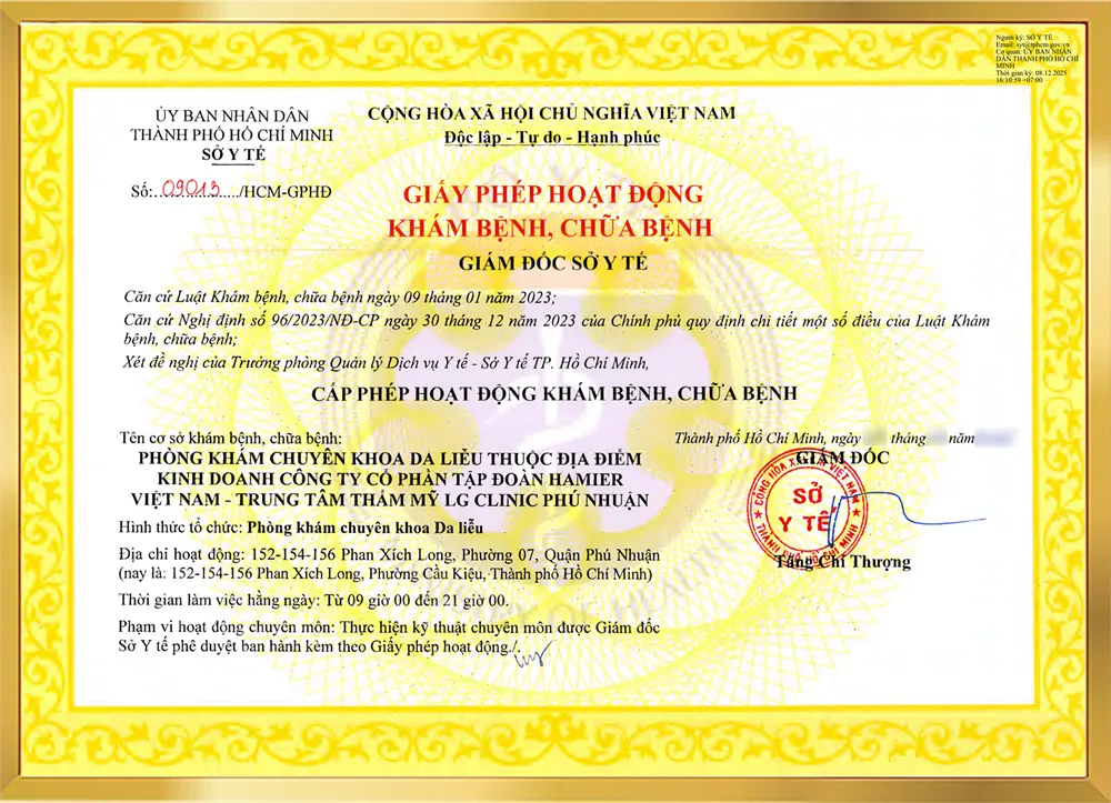 LG Clinic được Sở Y tế TP.HCM cấp phép hoạt động chuyên khoa da liễu, khẳng định tính pháp lý, chuyên nghiệp, an toàn. Chúng tôi cam kết tuân thủ nghiêm ngặt quy chuẩn y khoa, mang đến giải pháp chăm sóc da hiệu quả và bền vững.